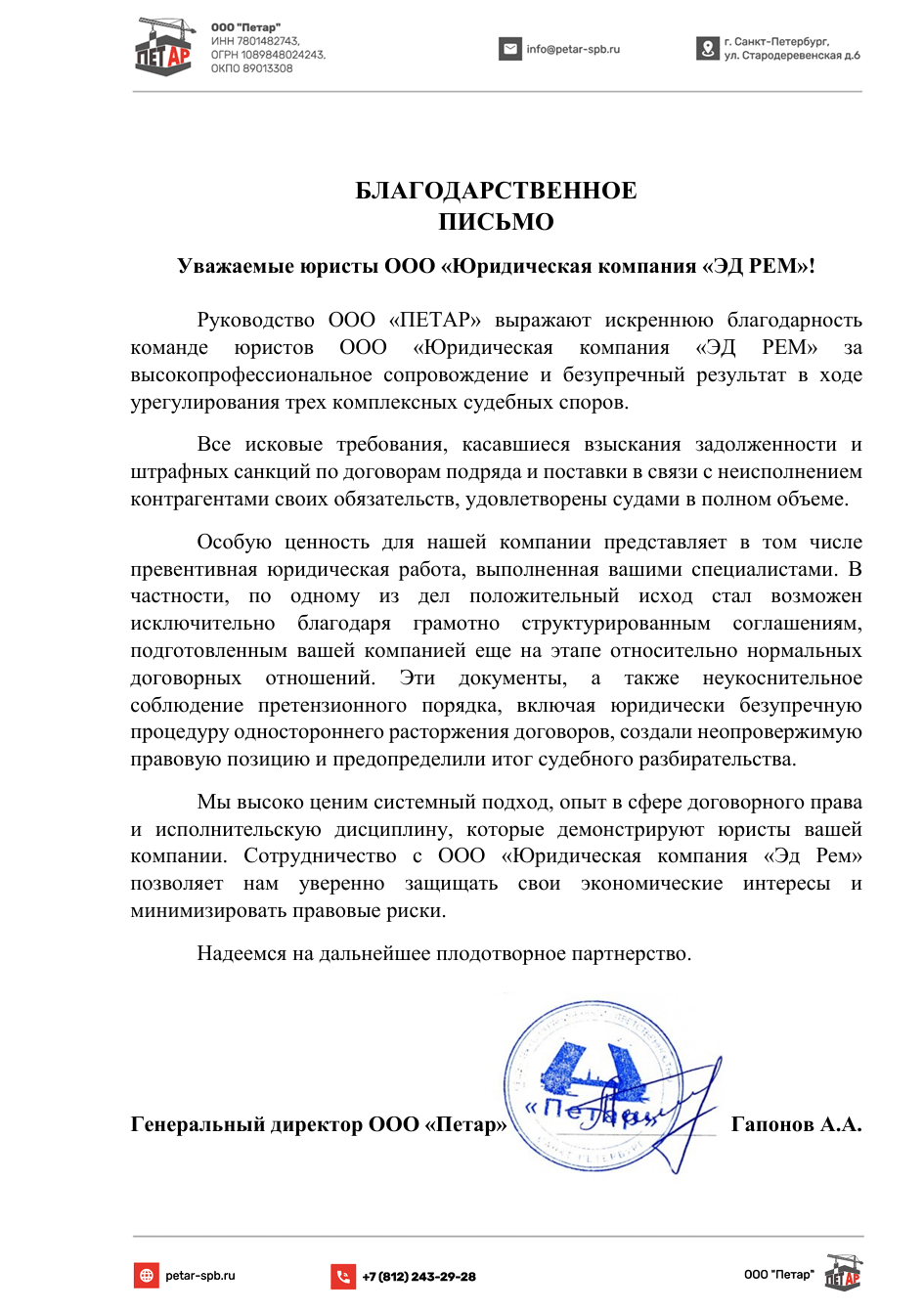 | Представление интересов в судебных заседаниях | В судах разных инстанций в пределах Санкт-Петербурга или посредством систем веб-конференций (ВКС) | от 12 000 руб. / судебное заседание |